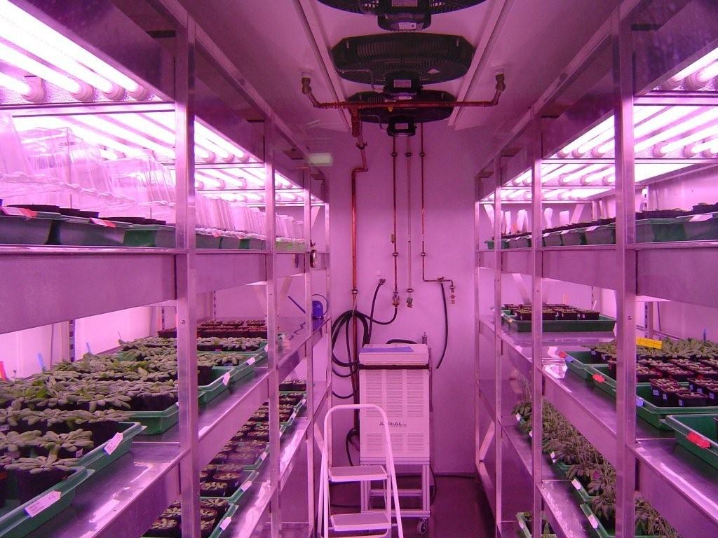 lighting systems are mounted inside large dark rooms and emulate the sun's